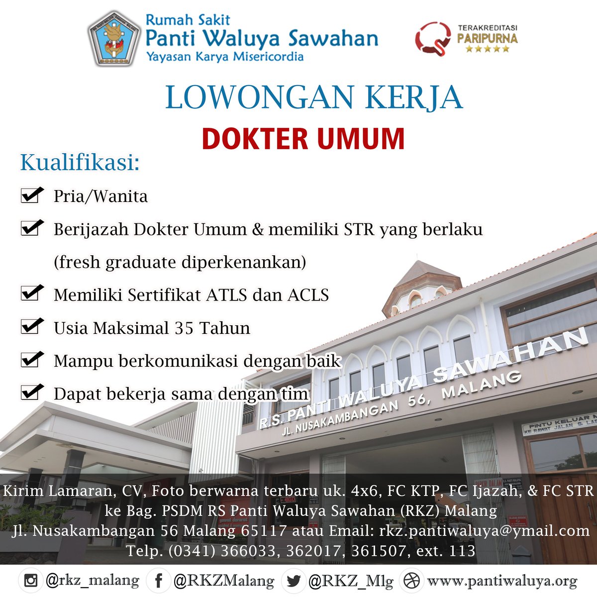 Rs Panti Waluya Mlg On Twitter Rs Panti Waluya Sawahan Rkz Malang Merupakan Rs Umum Tipe B Terakreditasi Paripurna Yang Berdiri Sejak Tahun 1929 Rspw Membuka Lowongan Dan Mengundang Anda Para